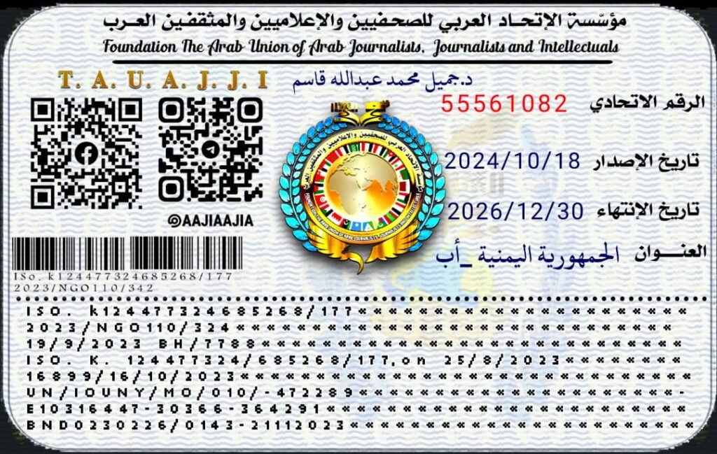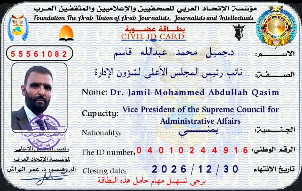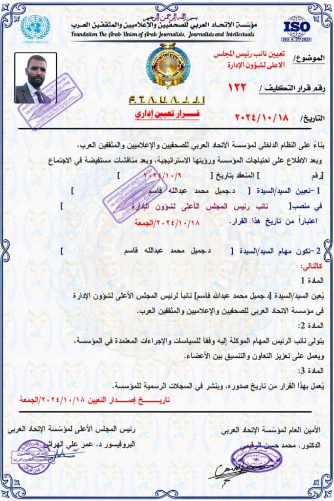 أصدرت مؤسسة الاتحاد العربي للصحفيين والإعلاميين والمثقفين العرب قرارًا بتعيين الدكتور جميل محمد عبدالله نائبًا للمجلس الأعلى لشؤون الإدارة. يأتي هذا القرار في إطار تعزيز القيادة الإدارية وتطوير الأداء المؤسسي في الاتحاد.